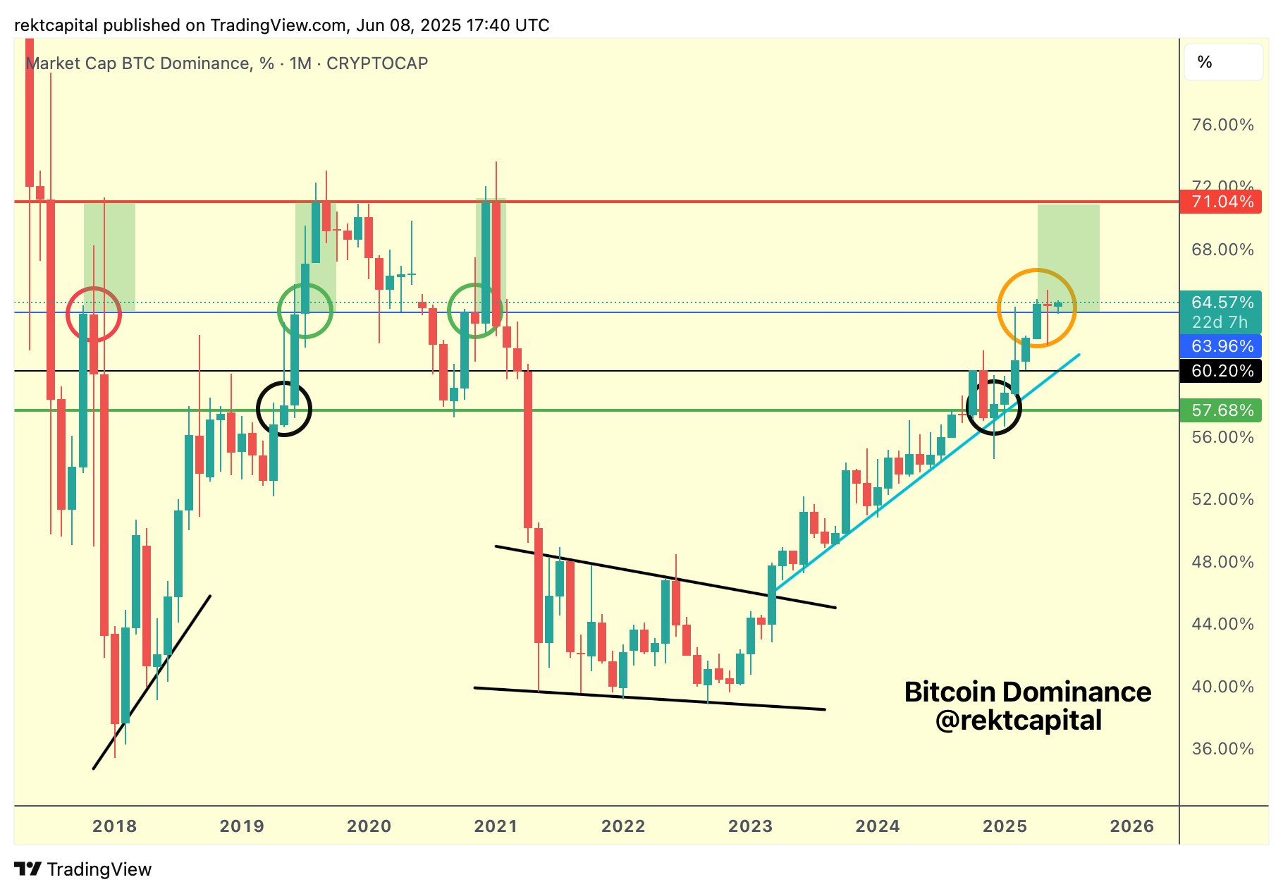 Tether’in hamlesine ek olarak Strategy Yönetim Kurulu Başkanı Michael Saylor, Pazartesi günü yeni bir Bitcoin alımı duyurabileceğini X platformunda ima etti. Analist Rekt Capital’e göre kurumsal talep sinyaliyle birleşen 1 milyar adet USDT basımı Bitcoin’in hakimiyet oranını yüzde 64’te dip yaparak potansiyel olarak yüzde 71’e taşıyabilir. Bu yükseliş senaryosu gerçekleşirse piyasa değerine göre en büyük kripto para yakında 111 bin dolardaki son zirvesini aşabilir.