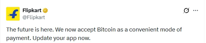 Yukarıda da Hindistan merkezli e-ticaret devi Flipkart’ın artık BTC kabul edecekleriyle ilgili paylaşımını görüyorsunuz. 2021 yılı için oldukça güzel bir gelişmeydi. Fakat bu da 1 Nisan şakasıydı.