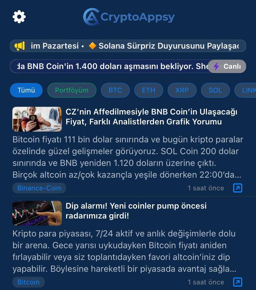 Bugünlerde en önemli şey yoğun gündemin ortasında güncel kalabilmek. Çünkü çok fazla şey oluyor ve şartlar/süreçler çok hızlı değişiyor. Tam da bundan dolayı CryptoAppsy canlı haber akışı fazlasıyla işinize yarayacak güncel kalmanızı sağlayacaktır. Burada hem haber özetlerine hem de önemli gelişmelerin detayların sadece tek tıklamayla ulaşabileceksiniz. Ayrıca haftanın önemli gelişmelerini kaçırmayacaksınız.