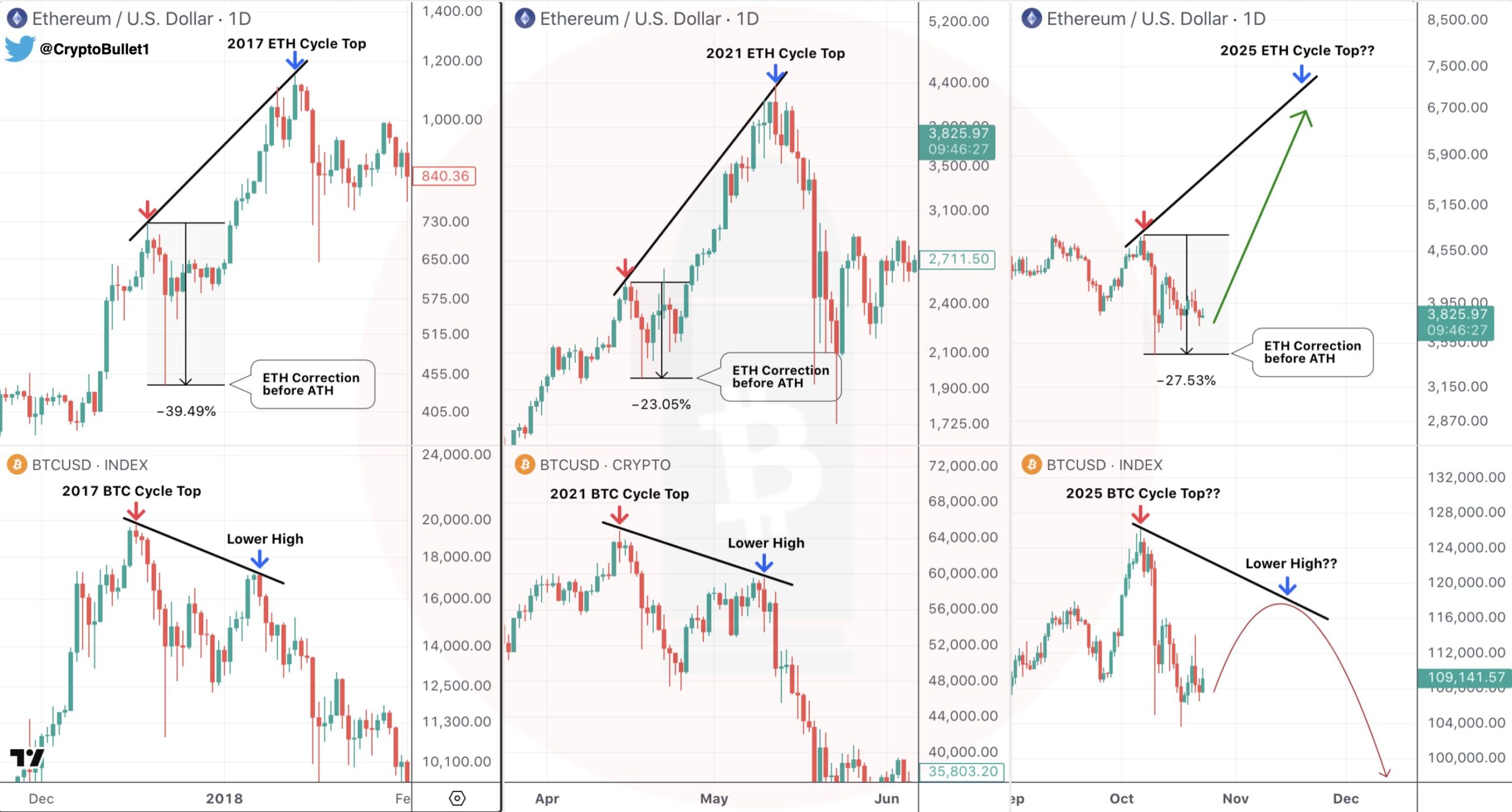 Döngünün zirvesinde her zaman ETH ve BTC arasında bir düşüş eğilimi vardır. Buna “likidite rotasyonu” denir. ETH daha yüksek bir zirveye ulaşırken, BTC daha düşük bir zirveye ulaşır.