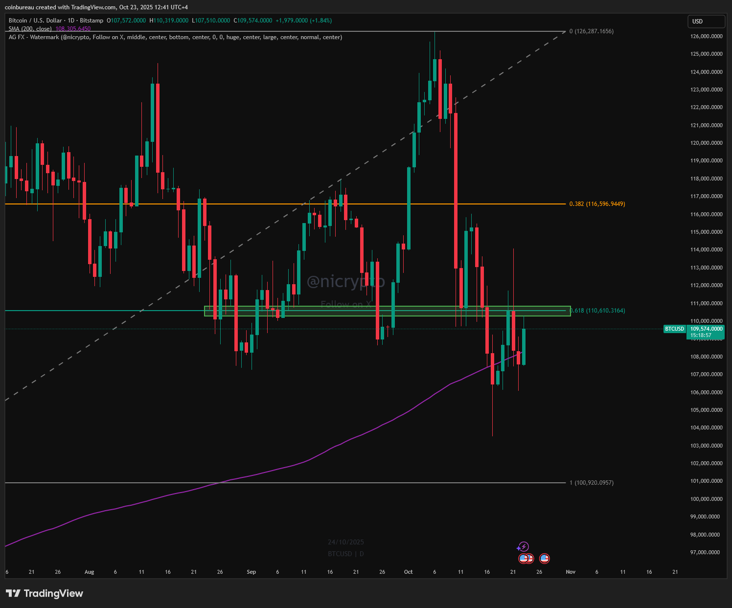 “Şu anda 200 günlük hareketli ortalamanın üzerindeyiz ve umarım bu seviyenin üzerinde kapanmayı başarabiliriz. Takip ettiğim bir sonraki bölge 110.000 – 111.000. Burası %61,8 fibonacci uzantısının ve önceki destek/direnç bölgesinin bulunduğu yer. Umarım bu seviyeyi tersine çevirebiliriz.”