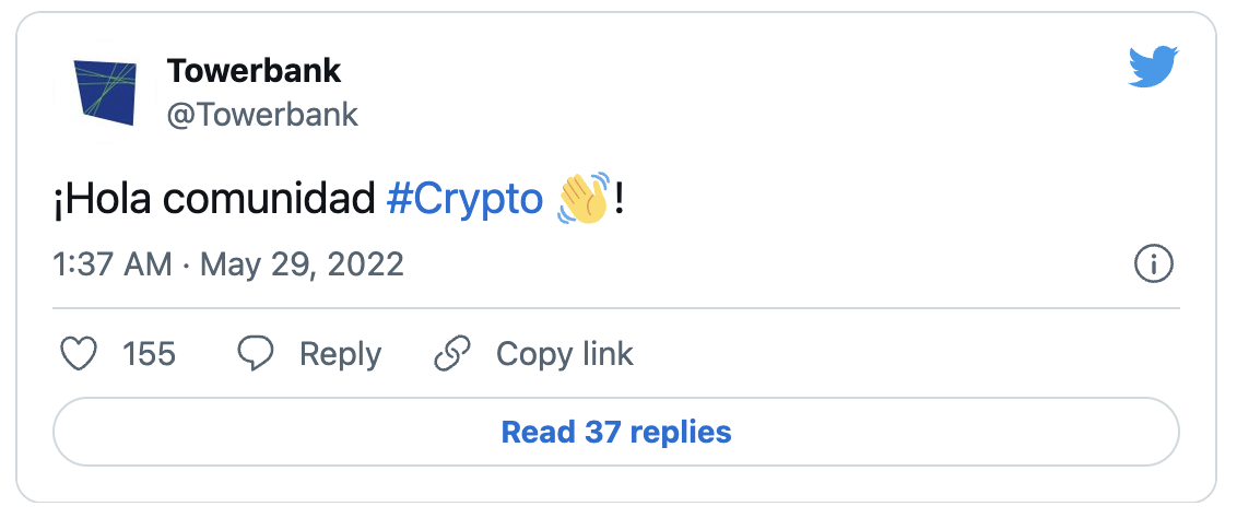 Towerbank’ın resmi Twitter hesabından 28 Mayıs’ta “merhaba, kripto topluluğu!” paylaşımında bulunularak, Panama’nın en iyi 30 bankasının Latin Amerika’daki kripto para meraklılarının ilgisini çektiğine dair söylentiler doğrulandı. Tweet o zamandan bu yana bankanın hesabında profile sabitlenmiş bir şekilde duruyor.