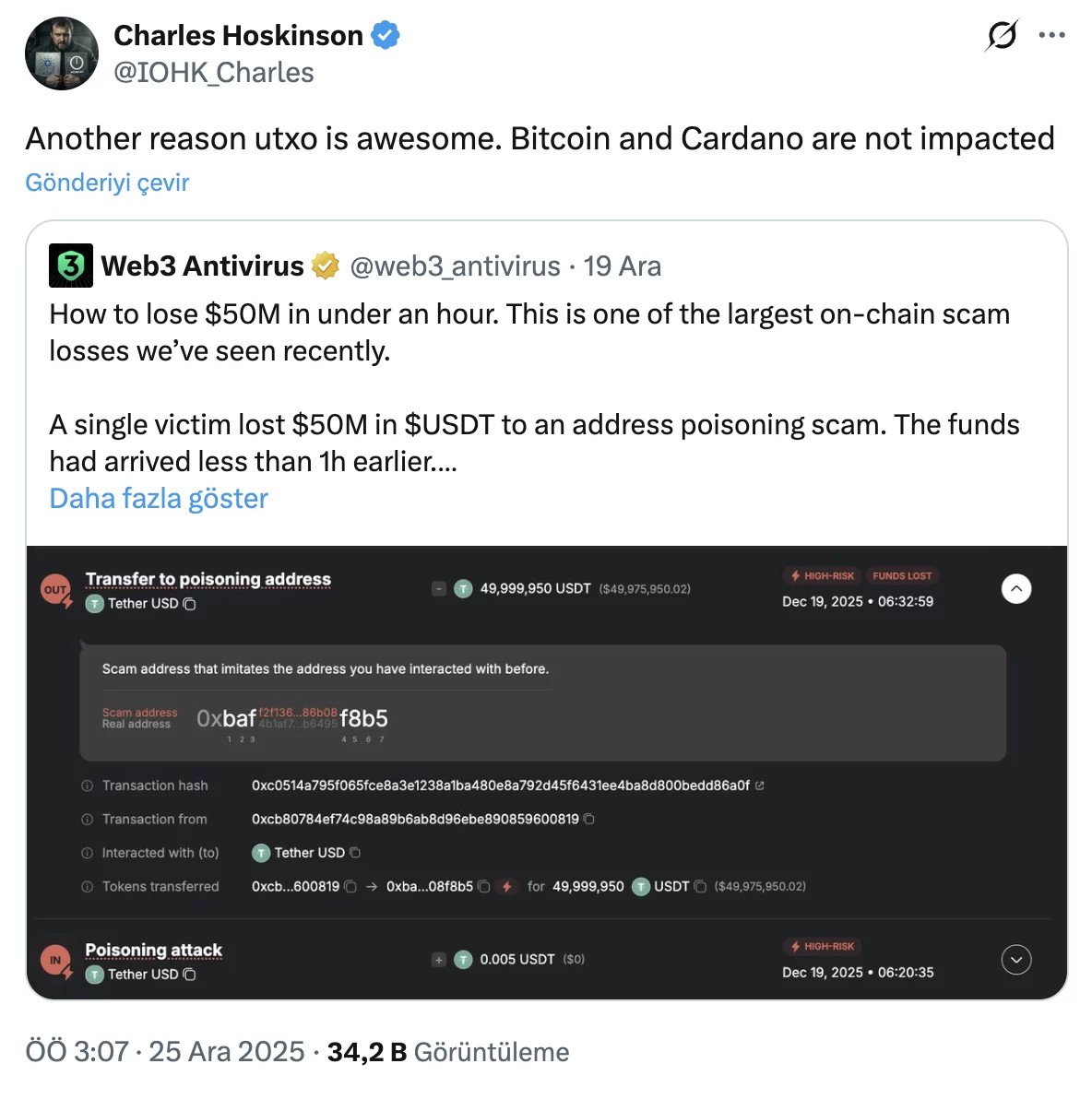 Hoskinson’a göre Bitcoin ve Cardano gibi UTXO modelini kullanan ağlar bu açıdan daha dayanıklı. UTXO modelinde her işlem yeni çıktılar üretiyor ve eski çıktılar tüketiliyor; kalıcı bir “hesap durumu” bulunmuyor. Bu nedenle görsel olarak zehirlenebilecek bir adres geçmişi de oluşmuyor. Olayın bir protokol açığı ya da akıllı sözleşme hatası değil, tasarım ile insan davranışının tehlikeli bir etkileşimi olduğunu vurguluyor.