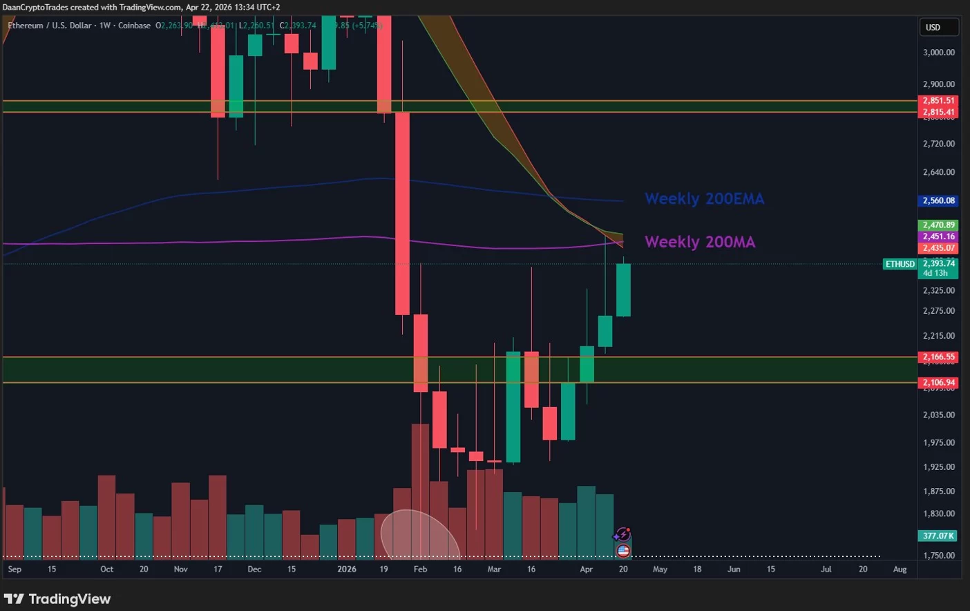 ETH grafiğini paylaşan DaanCrypto 2.400-2.500 dolar bandının önemli olduğunu yazdı. İşler yolunda giderse altcoin kralı haftalık 200MA’yı test edebilir. Daha da önemlisi haftalık kapanışın 200MA üzerinde olması 2.851 doların önünü açarken altcoinlerdeki rahatlama rallisinin hızlanmasını sağlayacak.