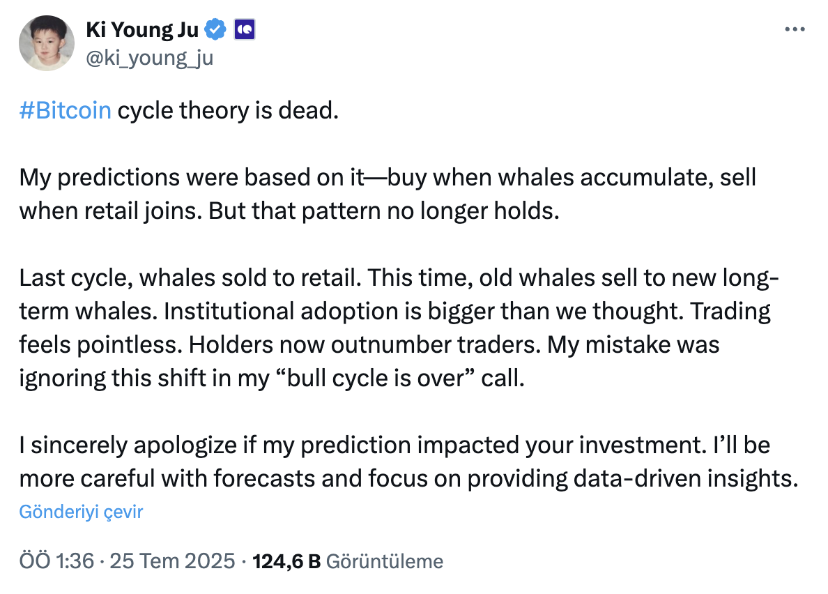 $78,815.41‘de döngü teorisinin sona erdiğini ilan eden CryptoQuant’ın kurucusu ve CEO’su Ki Young Ju, Nisan başında yaptığı “boğa döngüsü bitti” uyarısının gerçeği yansıtmadığını kabul etti. O dönem Bitcoin 80 bin dolar seviyesindeydi ve Ju, yoğun satış baskısının yükselişi engellediği görüşündeydi. Ancak en büyük kripto para Temmuz’da 123 bin 236 dolarla rekor tazeleyerek onu haksız çıkardı. Takipçilerine hitaben “Veri odaklı içgörüler sunacağım” diyerek özür diledi.