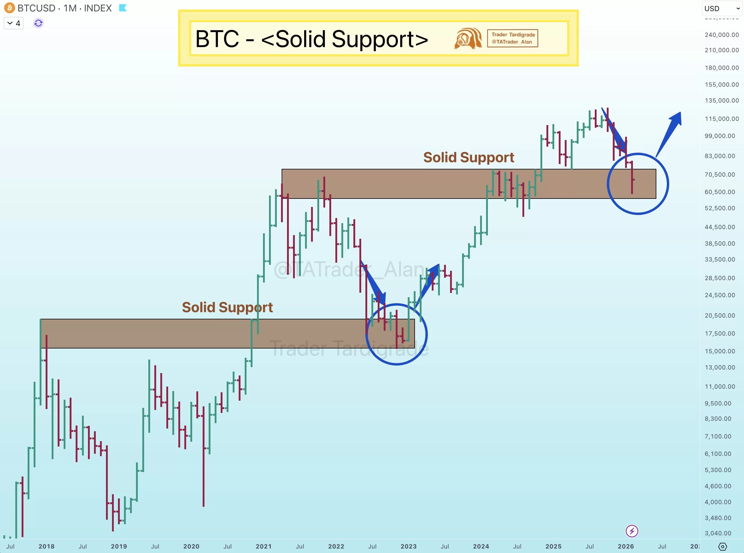 2021 desteği: şu anda 2026’da test ediliyor büyük ralli bekleniyor. Bunlar sadece bölgeler değil. Bunlar, BTC’nin bir sonraki yükseliş için hazırlandığı kanıtlanmış birikim bölgeleri.”