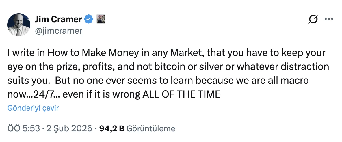 Cramer’ın yorumlarında dikkat çeken bir diğer başlık ise MicroStrategy (yeni adıyla Strategy Inc.) ve şirketin yönetim kurulu başkanı Michael Saylor oldu. Bitcoin’i kurumsal bilançoya taşıyan en büyük savunuculardan biri olan Saylor’ın şirketi, 5 Şubat’ta finansal sonuçlarını açıklamaya hazırlanıyor. Cramer, bu tarih öncesinde hem MicroStrategy hisselerinde hem de Bitcoin fiyatında kısa pozisyonların baskı kurmaya çalışabileceğini öne sürdü.