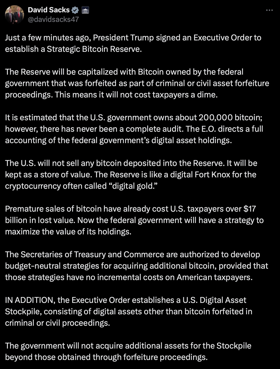 Kararname, Bitcoin dışında kalan diğer kripto paralar için de “ABD Kripto Para Rezervi” oluşturulmasını öngörüyor. Bu rezerv sadece hükümetin el koyduğu kripto paralardan oluşacak. ABD hükümeti piyasadan ek kripto para satın almayacak.