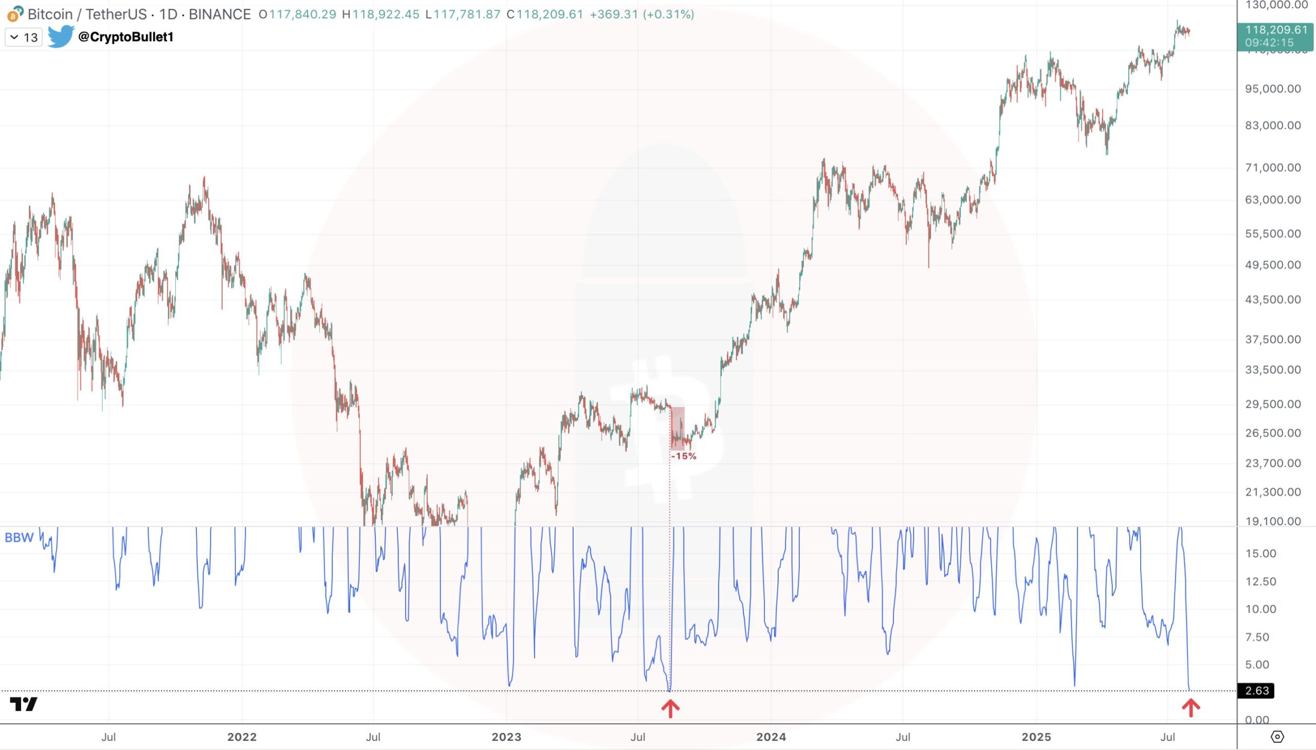 “BTC günlük grafik. Bollinger Bantları Ağustos 2023’ten bu yana en dar seviyede (Çöküş öncesindeki Şubat 2025’ten bile daha dar!).