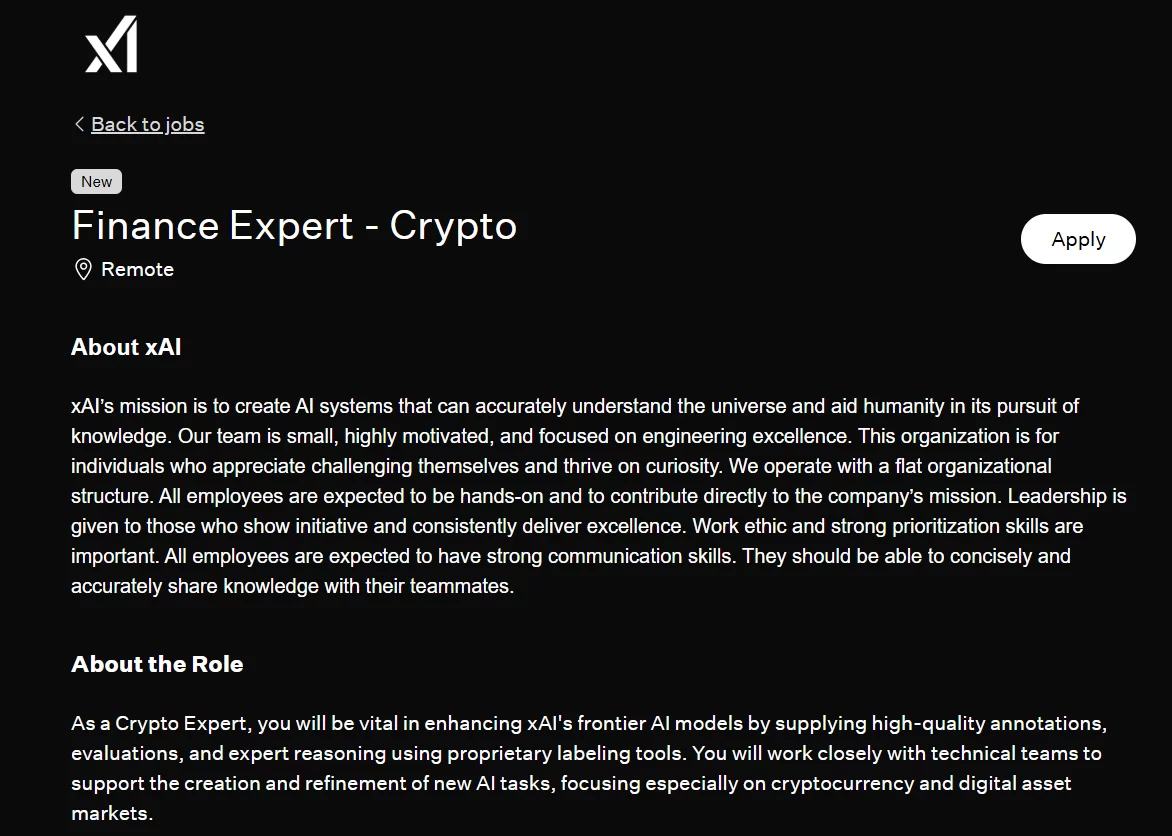 Elon Musk’ın yapay zeka şirketi xAI, SpaceX ile birleşerek 1,25 trilyon dolarlık tek bir şirkete dönüştü. Bu birleşmenin ardından AI şirketi kripto para iş ilanı yayınladı. Yapay zeka modellerini eğitecek kripto para uzmanları aranan ilanda “piyasaların inceliklerini bilen” uzmanlar aranıyor.