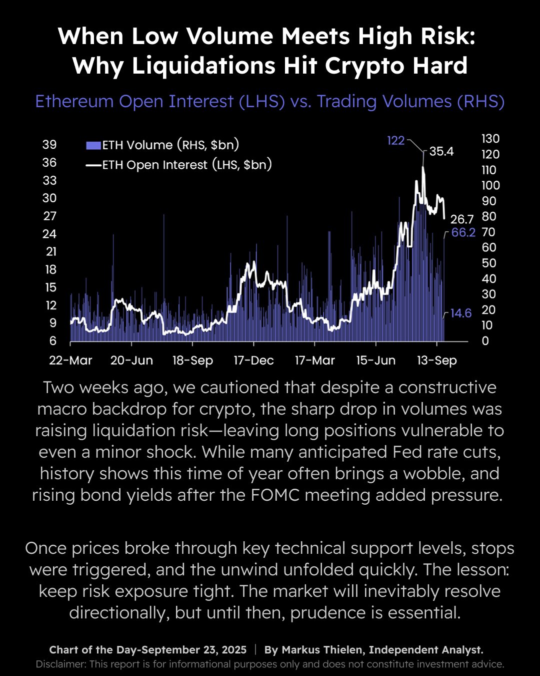$2,315.99 piyasasında işlem hacimlerindeki sert düşüş kaldıraçlı pozisyonları savunmasız bırakarak yatırımcıları ağır tasfiyelerle sarstı. Son haftalarda artan faiz belirsizliği ve Fed’in son kararları sonrası tahvil getirilerindeki yükseliş piyasanın dengesini daha da bozdu. Matrixport’un 23 Eylül tarihli raporu düşük işlem hacminin yüksek riskle birleştiğinde kripto paralarda kırılganlığı hızla artırdığını ortaya koyuyor.