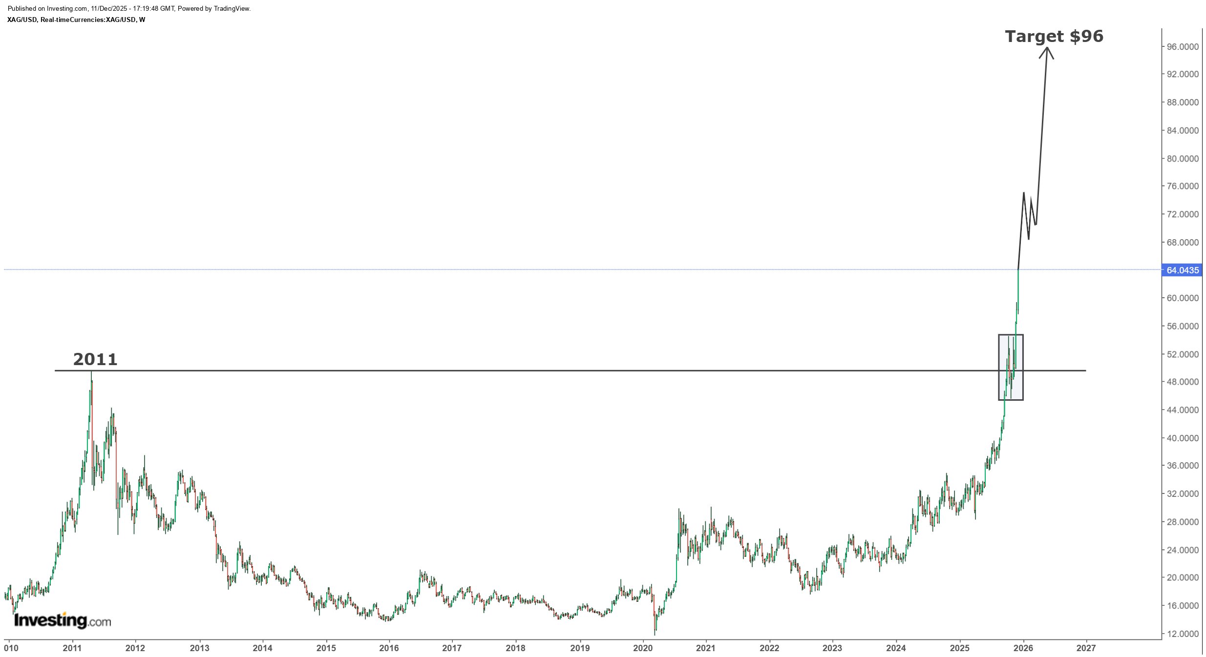 Mega Cup & Handle formasyonunun ölçülen hareketi 96 doları hedefliyor ve bu hedef 2026’nın başlarında gerçekleşecek gibi görünüyor. Şimdilik gümüşün parabolik yükselişinin tadını çıkaralım!