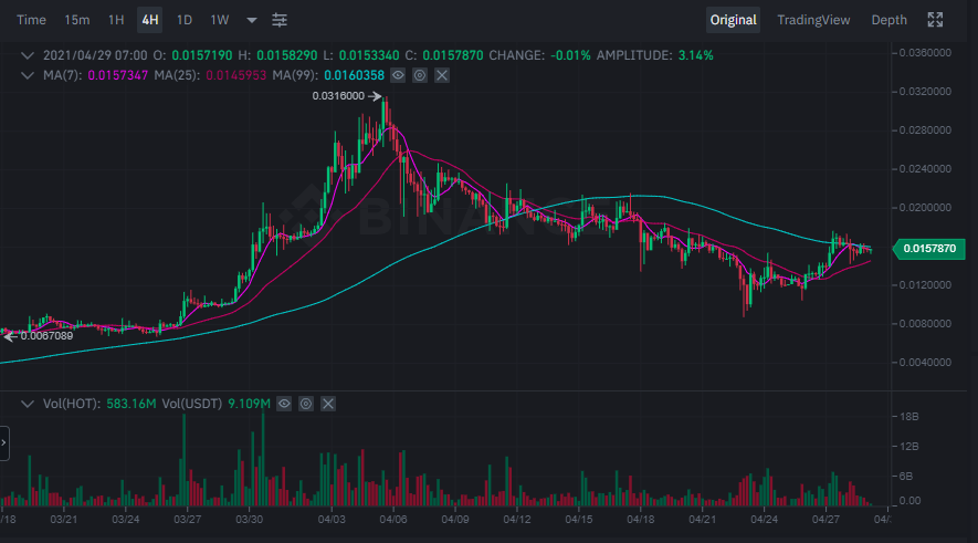 Hot 5 Nisan’da 0,0316 dolar ile rekor kırdıktan sonra düşüşe geçti. Düşüş sırasında her ne kadar 0,0088 dolar bandına kadar geri çekilme yaşanmış olsa da HOT sonrasında yeniden 0,01 dolarlık önemli psikolojik seviyenin üzerine yükselmeyi başardı.