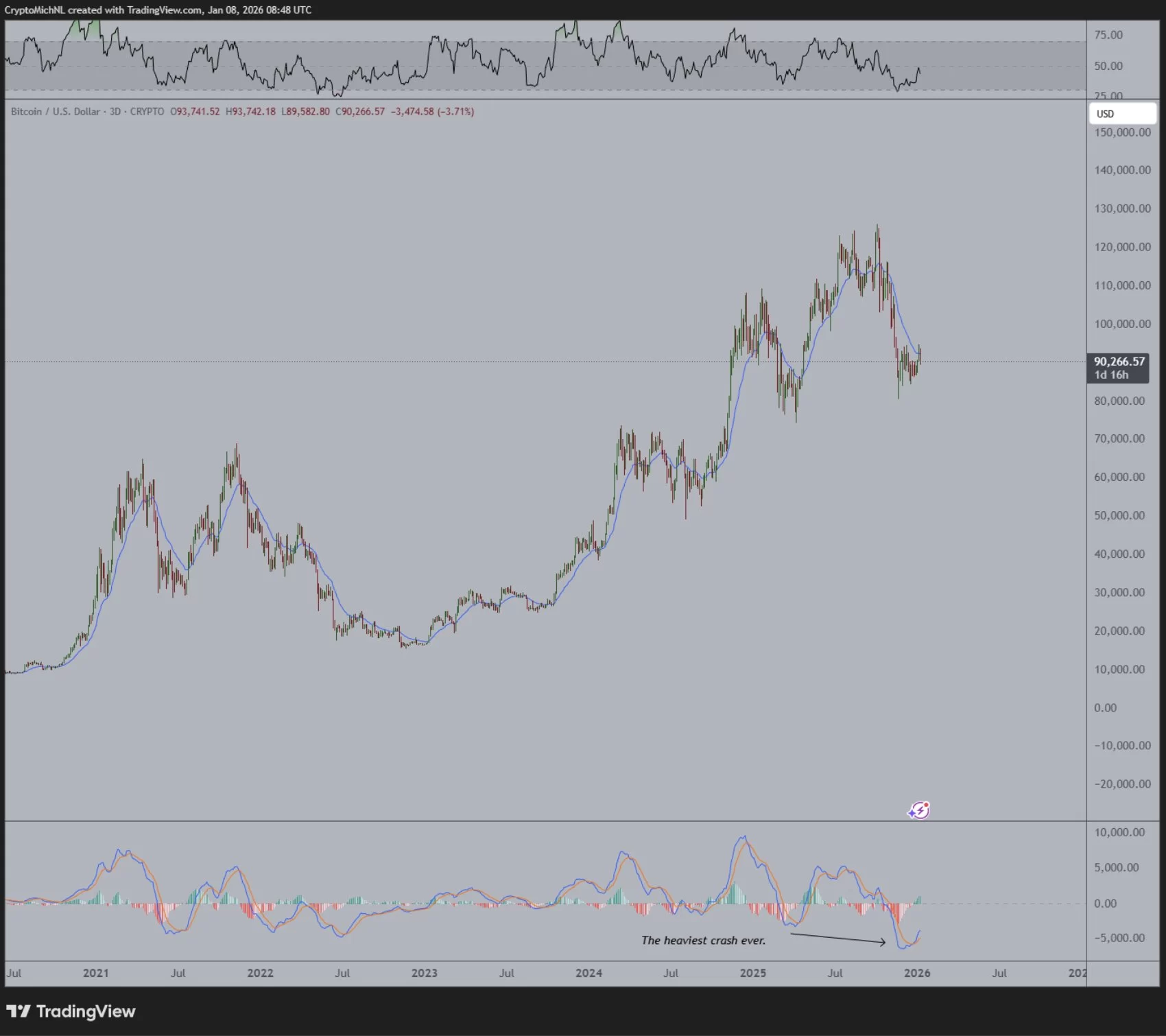 3 günlük MACD hiç bu kadar düşmemişti. Bu çöküş, 2022 Luna Çöküşü, 2020 COVID Çöküşü veya 2018 ayı piyasasından daha ağırdı. Bu dönemlerde alım yaparsanız, her seferinde büyük karlar elde edersiniz.”
