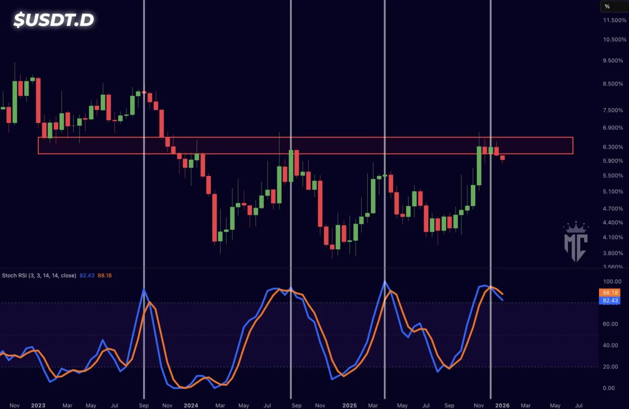 USDT Dominance yukarıdaki dirençten dirençten tekrar geri dönmeye başladı. Mister Crypto Stoch RSI da düşüşe geçmesi nedeniyle yakın gelecekte rahatlama rallisi görebileceğimizi savunuyor.