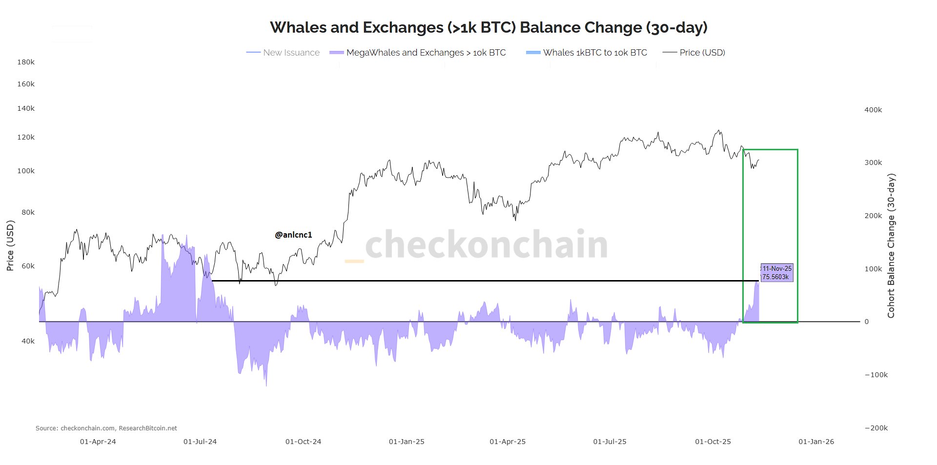 “Mega balinalar ve borsalar (10K BTC), son 30 günde net +75K BTC birikim gösteriyor. Birikim, 110K ile pozitife dönüyor ve 101K seviyelerine kadar iniyor. Bu, son 1 yılın en güçlü pozitif denge değişimi.”