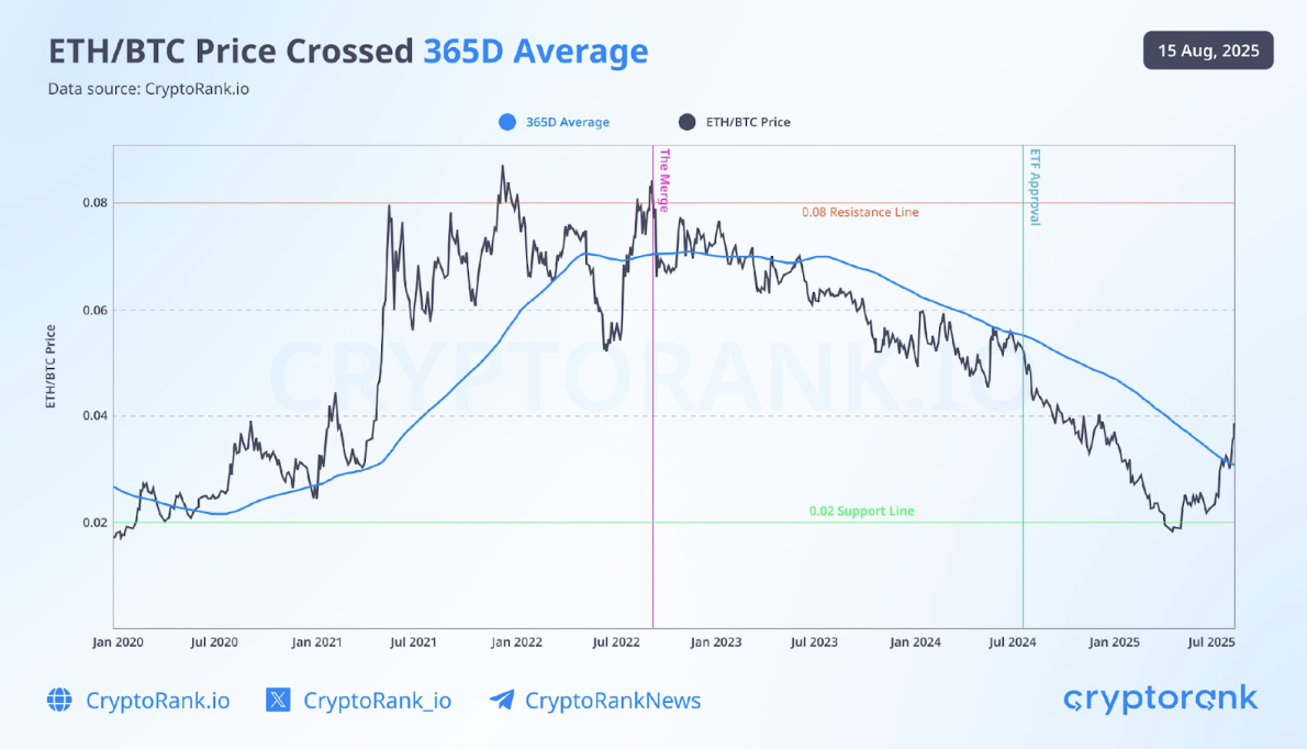 Ayrıca Ethereum, Bitcoin karşısında 0.02 civarındaki kilit destekten toparlanarak 365 günlük hareketli ortalamasının üzerine çıktı ve en büyük kripto paraya karşı zemin kazanmaya başladı. ETH/BTC paritesinde tepe seviye 0.08 seviyesinde. Bitcoin’in 120.000 dolar civarında istikrara kavuşması halinde Ethereum’un ETH/BTC paritesindeki bu tarihsel zirveyi yeniden ziyaret etmesi için yaklaşık 9.600 dolara yükselmesi gerekiyor.