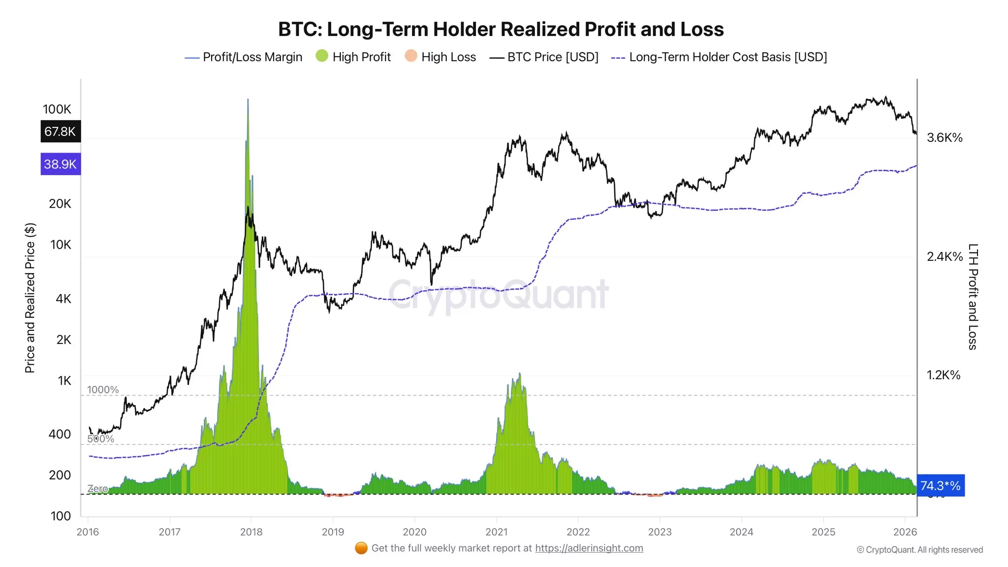 “BTC’deki durum düzelmediğinden, piyasadaki farklı yatırımcı gruplarının davranışlarını analiz etmeye devam etmek önemini korumaktadır. Bu çerçevede temel gruplardan biri, kısa vadeli fiyat dalgalanmalarına daha az duyarlı olduğu bilinen Uzun Vadeli Sahipler (LTH) grubudur. Şu anda, LTH’ler ortalama olarak yaklaşık %74 kar elde etmektedir.