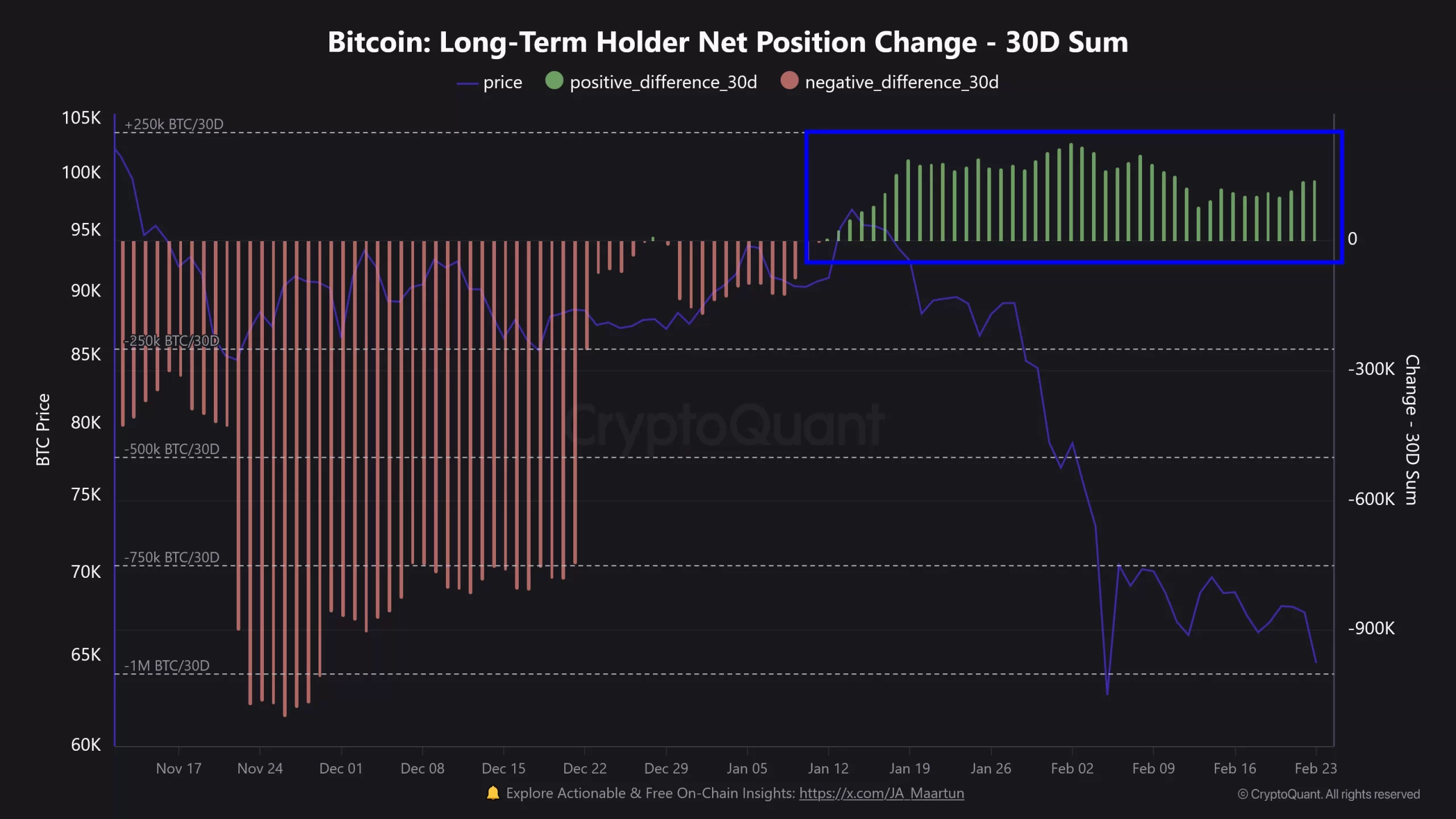 ETF’ler beş hafta boyunca kan kaybetti. Bunların hepsi oldu. Ancak, LTH’ler satmıyor. Aslında on-chain verileri geniş çaplı bir teslimiyet değil, istikrarlı bir birikim gösteriyor. Bana göre bu, nihai dipten çok bir konumlandırma sıfırlaması gibi görünüyor.