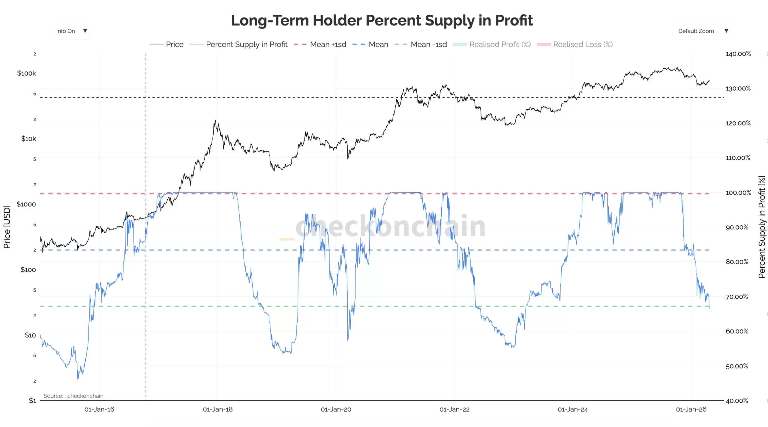 Darkfost son on-chain değerlendirmesinde LTH (Uzun Vadeli Yatırımcı) grubunun durumunu ele aldı. LTH kategorisine geçen tüm BTC yatırımcıları son 6 ay içinde BTC keskin biçimde düştüğünden zarar yazmaya başladı. Bugün, uzun vadeli yatırımcıların elinde bulunan ve kârda kalan arzın yüzdesi %66,5’e ulaştı. Bu, genel tarihsel aralıkla karşılaştırıldığında nispeten düşük bir seviye.