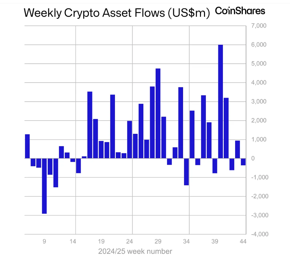 Yazı hazırlandığı sırada yayınlanan CoinShares raporu bize kurumsal tarafta neler olup bittiğini açıklıyor. Öncelikle son faiz indirimine rağmen geçen hafta tüm kripto ürünlerinde toplam 360 milyon dolarlık net çıkış gördük. Fed Başkan Powell’ın “Aralık ayında indirim olmayabilir, ihtimal düşük, kesin indirim yok” minvalindeki açıklamaları yılın son toplantısında faizlerin sabit kalabileceği yönünde anlaşıldı.