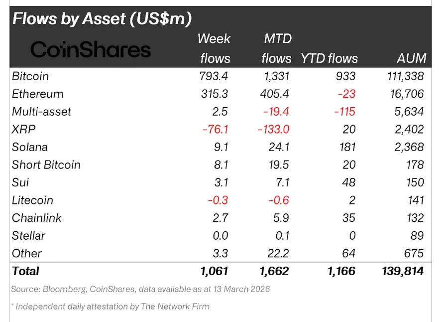 Bitcoin tüm girişlerin %75’ini oluşturarak 793 milyon doları temsil ediyor. Üç haftalık toplam girişler 2,2 milyar doları aştı. Önceki 5 haftalık net çıkış serisinde 3 milyar dolarlık satış görmüştük yakın girişler bunu dengeleyebilir.