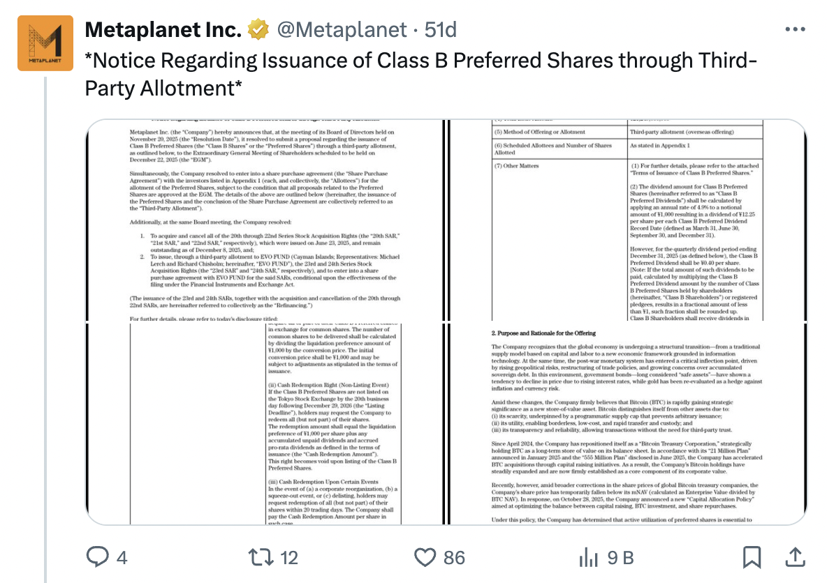 $93,471.36 yatırımının boyutunu artırmak amacıyla 150 milyon dolar tutarında süresiz imtiyazlı hisse senedi ihraç edeceğini duyurdu. Şirketten yapılan açıklamada bu adımın yıllık yüzde 4,9 oranında sabit temettü getirisi sunan B sınıfı hisseler aracılığıyla finanse edileceği belirtildi. Toplanan fonlar Metaplanet’in agresif büyüme stratejisi doğrultusunda yeni Bitcoin alımlarında kullanılacak.