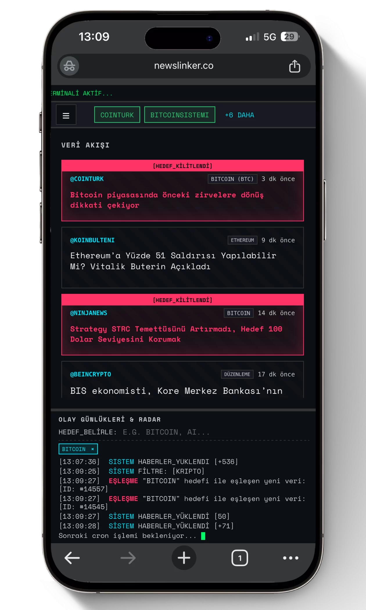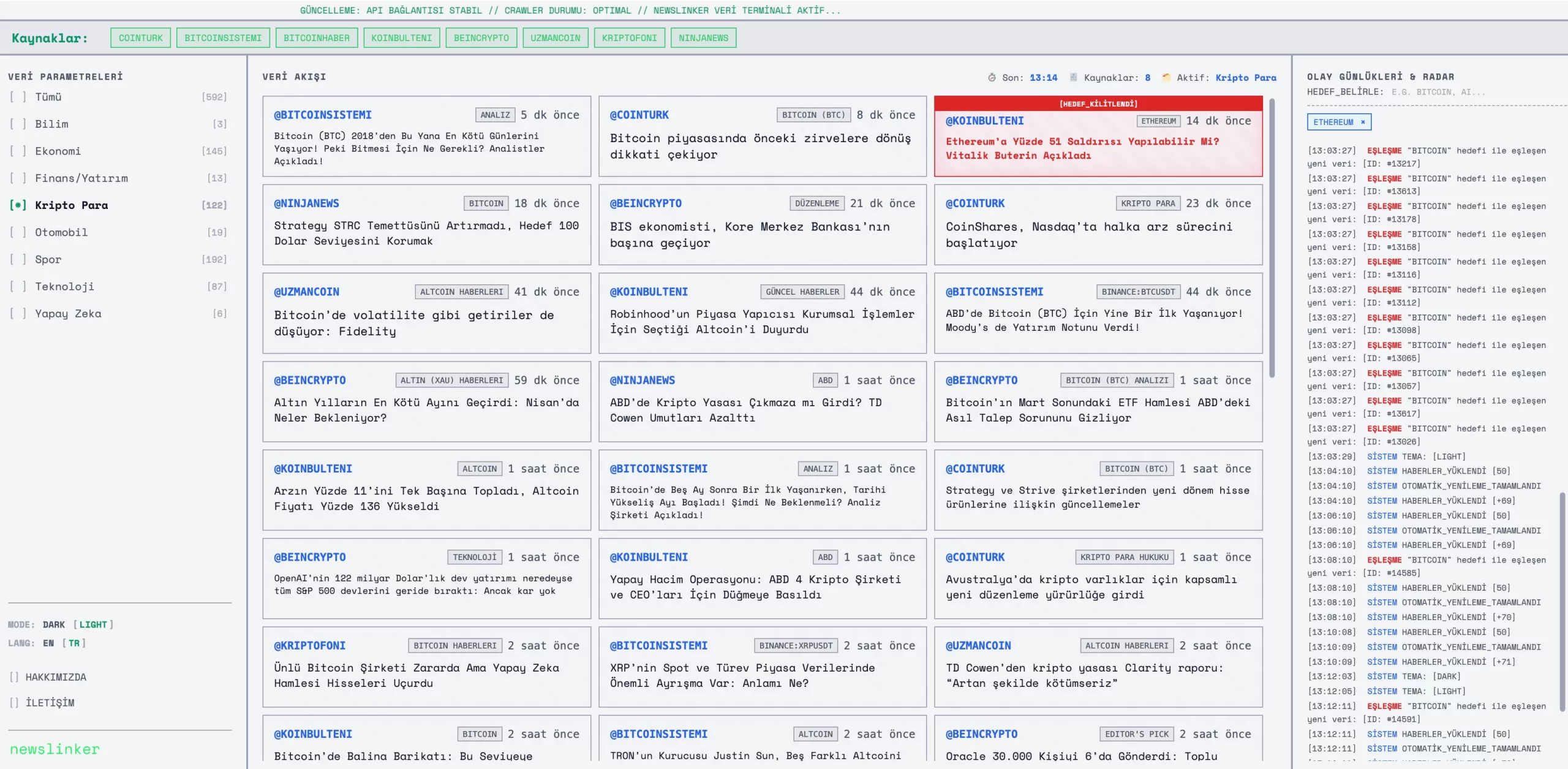 Newslinker bir haber toplayıcı websitesinden öte bir haber terminali deneyimi sunuyor, dark ve light tema ve İngilizce/Türkçe dil seçenekleriyle, hem masa üstü hem mobilde okuyucu deneyimini önceliyor. Örneğin hedef kelime olarak Ethereum belirlediğinizi varsayarsak, aşağıdaki görseldeki gibi haber düştüğü anda o haberi sizin için öne çıkarıyor. Ayrıca Teknoloji, Finans, Spor, Kripto Para ve Otomobil gibi en çok tüketilen haber kategorilerini de barındırıyor.