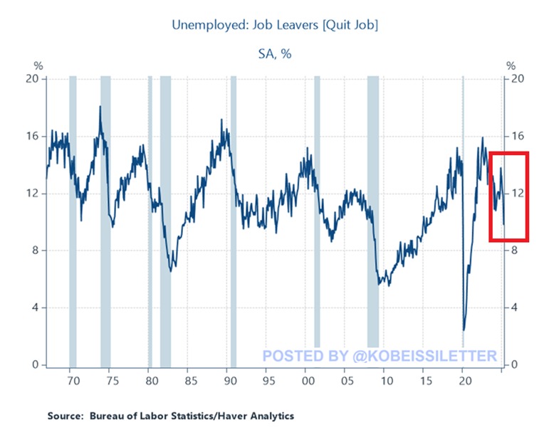 Sonuç olarak, toplam istihdam içinde işten ayrılanların oranı 2 puan düşerek %9,8’e geriledi ve Mayıs 2021’den bu yana en düşük seviyeye ulaştı. Son 6 ayda bu oran 4 puan düştü. Geçmişte, böyle hızlı bir düşüş, resesyon dönemleri dışında nadiren görülmüştü. Diğer bir deyişle, ekonomik belirsizlik nedeniyle istihdamın yavaşlamasıyla Amerikalılar iş değiştirme konusunda daha temkinli davranmaya başladı. İş piyasası kötüye gidiyor.”