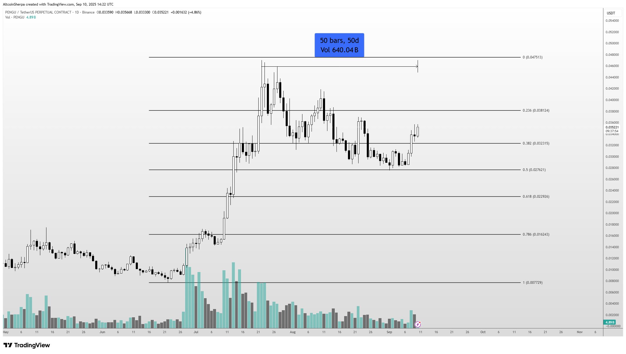 Sherpa bu konuda genel bir değerlendirme yaptı ve Pengu, Fartcoin gibi meme coinlerde tetikte bekleyenlere fikir verebilir. 2 aydır devam eden düşüş eğilimine odaklanan analist erken yükseliş evresinde Pengu Coin tarzında kripto paraların artık hazır olduğuna inanıyor. İlk direnç 0,0381 dolarda ve devamında 0,0475 hedefleniyor.
