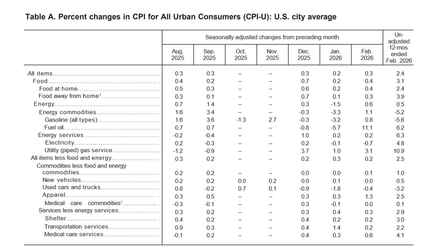 “Gıda endeksi, evde tüketilen gıda endeksi gibi ay boyunca %0,4 artarken, ev dışında tüketilen gıda endeksi %0,3 arttı. Enerji endeksi de Şubat ayında %0,6 artarak yükseldi. Gıda ve enerji hariç tüm kalemler endeksi Şubat ayında %0,2 arttı. Ay boyunca artış gösteren endeksler arasında sağlık hizmetleri, giyim, ev eşyaları ve işletme, uçak biletleri ve eğitim yer aldı. Buna karşılık, iletişim, ikinci el otomobil ve kamyon, motorlu taşıt sigortası ve kişisel bakım endeksleri Şubat ayında düşüş gösteren başlıca endeksler arasında.” – BLS TÜFE Raporu