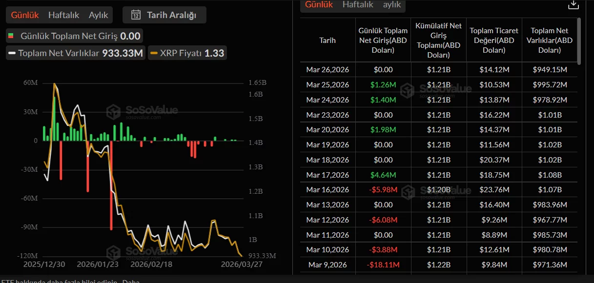 XRP Coin cephesinde ETF hacimleri düştü ve yatırımcılar büyük ölçüde satıcı konumunda.9 Mart tarihindeki 18 milyon dolarlık çıkışı 4-5 milyon dolarlık satışlar izledi ve girişleri oldukça cılız kaldı. ETF net varlıkları 1 milyar doların altına iniş çıkarken bu hafta 1 milyar doların altına sabitlendi. Sosovalue tarafından derlenen rakamlar kurumsal yatırımcıların XRP Coin ilgisinin zayıfladığını gösteriyor.