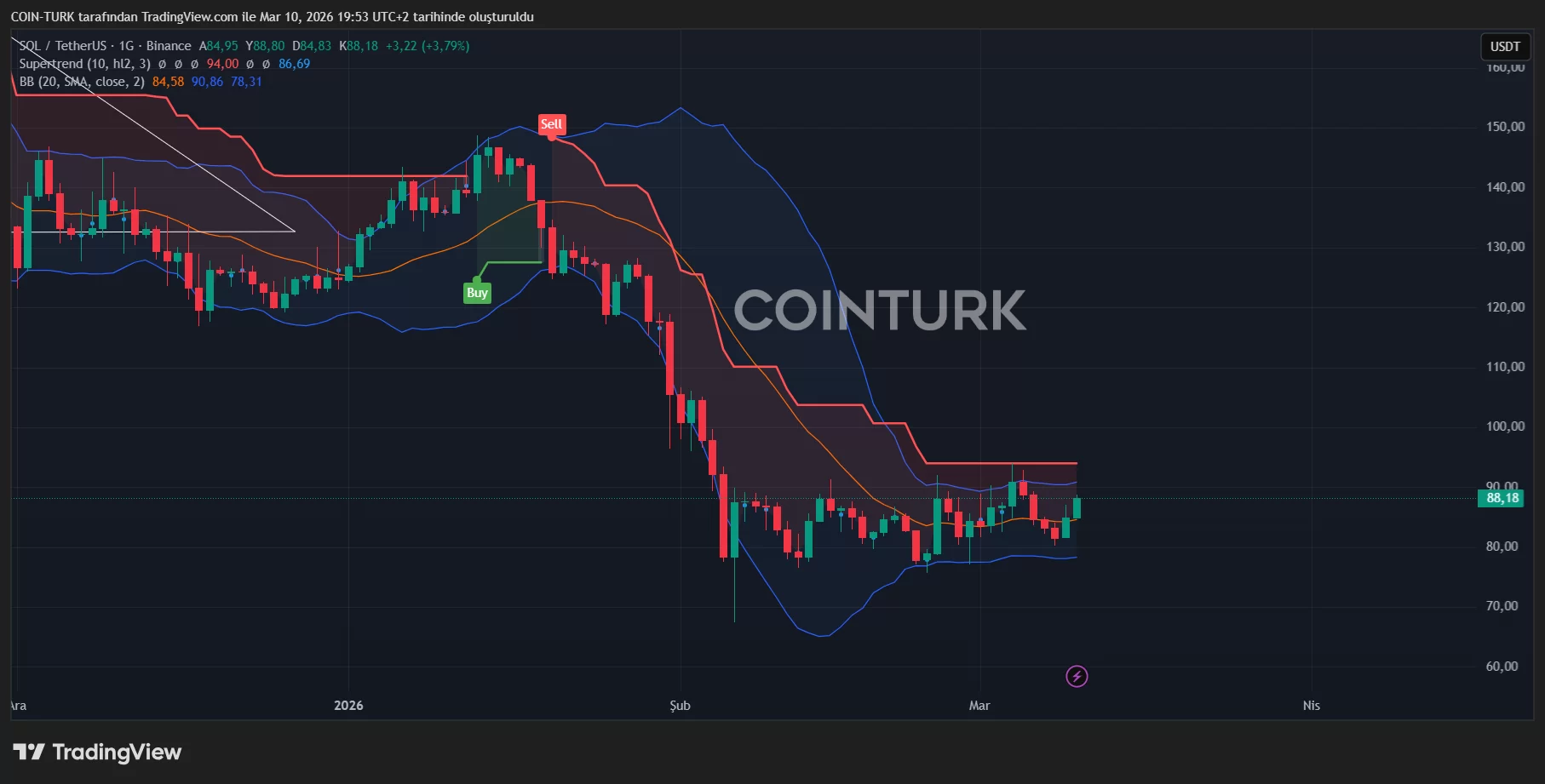 Grafik SOL Coin için XRP’den çok farklı değil. Yerel dip yapan fiyat burada da 33 gündür konsolide oluyor. Böylesi uzun konsolidasyon süreçlerinin nihayetinde büyük kırılmalar getirdiğini biliyoruz. Yani 93 veya 77 dolardan biri kırılacak ve SOL Coin hedefine koşacak.