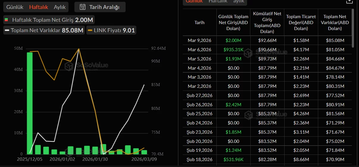 ETF kanalında diğerlerine kıyasla LINK Coin çıkış görmüyor cılız girişler devam ediyor.