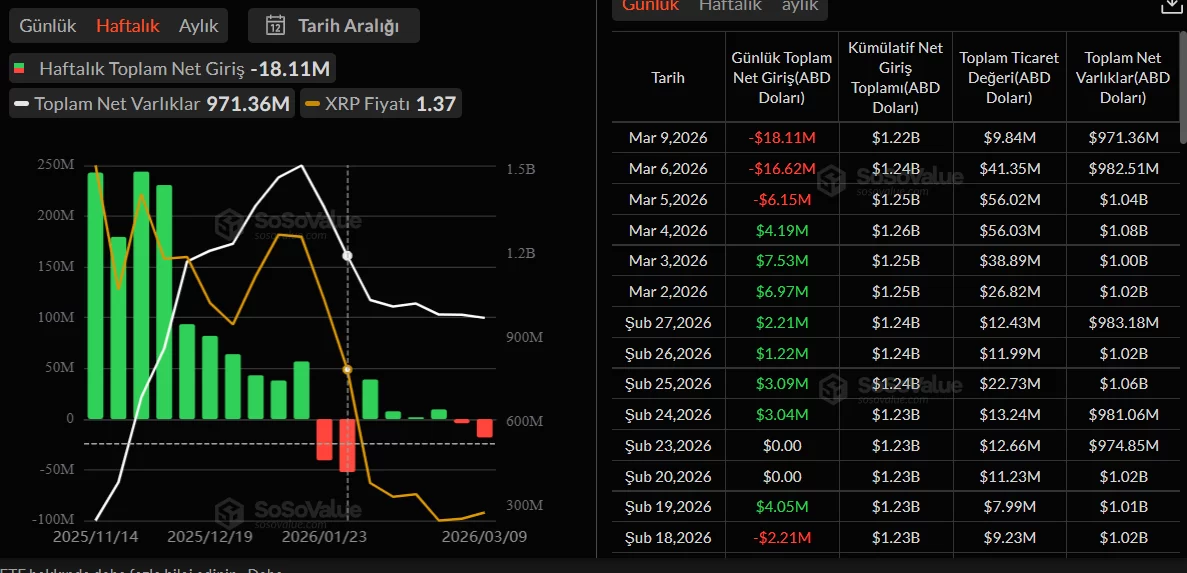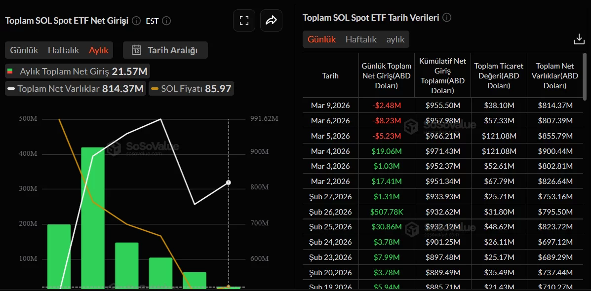 Çıkışlar XRP Coin’e özgü değil ve SOL Coin tarafında da satışlar var ancak bu satışlar o kadar güçlü değil. 4 Mart günü 19 milyon dolar giriş varken sonraki 3 iş gününde bunun sadece 15 milyon dolarlık bölümü satışa döndü. Kaldı ki Mart ayı halen 21,57 milyon dolarla SOL Coin için net giriş ayı. Lansmandan bugüne SOL Coin aylıkta hiç net çıkış yaşamadı. RWA ve ödeme altyapısı hikayesinde Ethereum’un en güçlü alternatifi olması hasebiyle bu eğilim normal.