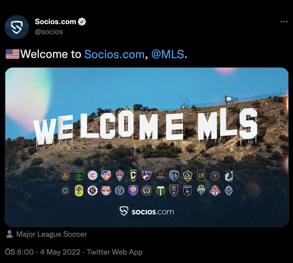 ABD’deki en büyük profesyonel futbol ligi Çarşamba günü Socios ile ortak bir duyuru yaptı ve bu ortaklığın taraftarların 26 ortak MLS kulübü için “özel ödüller, anketler ve fırsatlara” erişmesine yardımcı olacağını açıkladı.