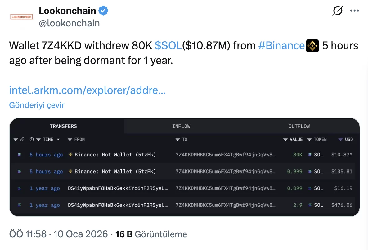 On-chain veri platformu Lookonchain’in paylaştığı bilgilere göre, 365 gündür hareketsiz olan bir Solana balinası Binance’ten 80 bin SOL çekerek varlıklarını özel bir cüzdana taşıdı. Mevcut fiyatlarla yaklaşık 10,8 milyon dolar değerindeki bu transfer, Solana topluluğunda büyük yankı uyandırdı. Genel kanı, balinanın bu hamleyle kısa vadeli bir satış planlamadığı, aksine uzun vadeli bir birikim stratejisi izlediği yönünde.