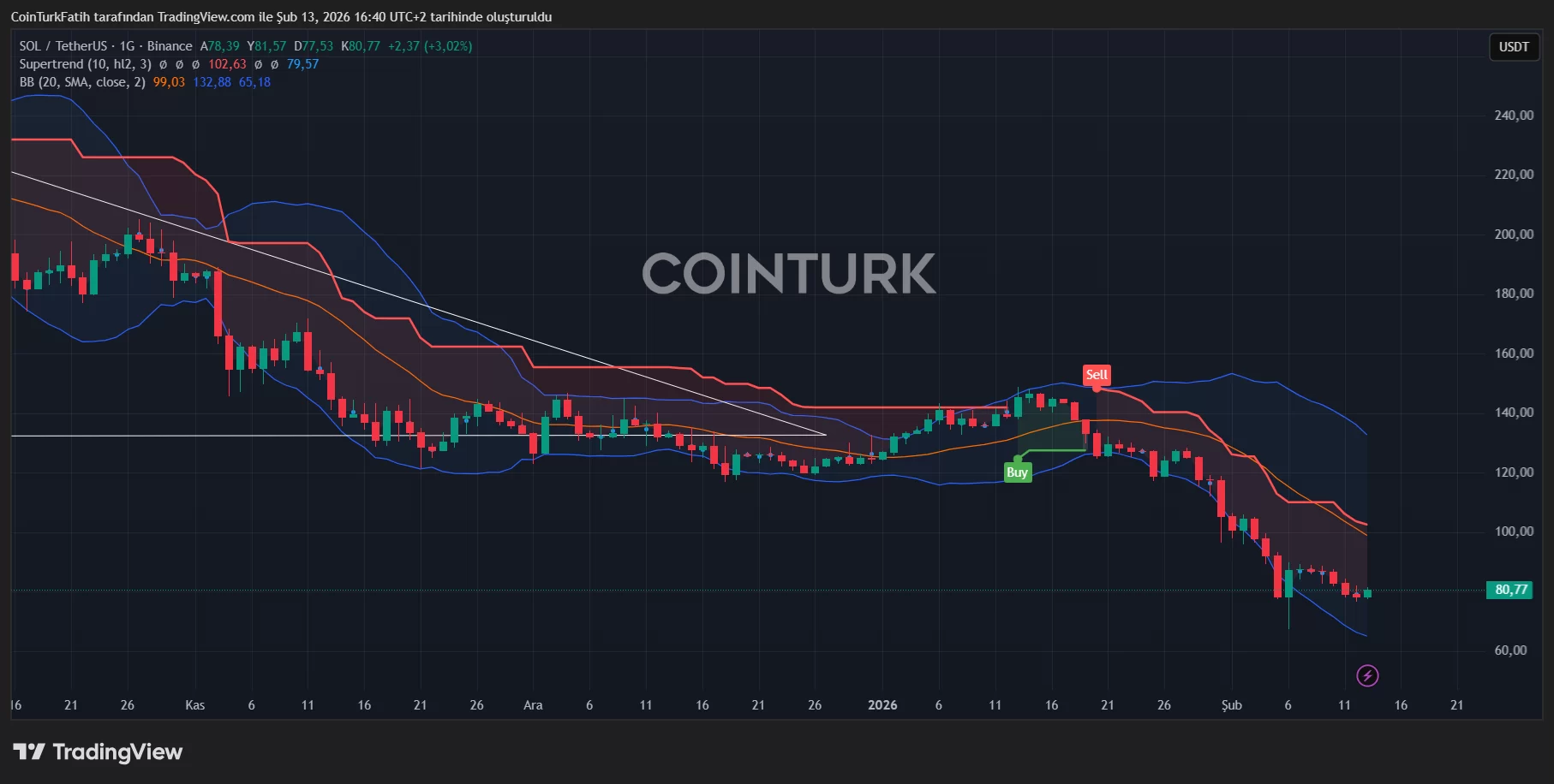 133 dolar SOL Coin için önemli bir eşikti ve kaybedildi. Ocak yükselişi umut verse de fiyat bu kilit seviyenin üzerinde kalıcılık elde edemedi. Ardından milyarlarca dolarlık vadeli tasfiyesinin ortasında SOL Coin 118 ve 98 dolar tabanlarını da kaybetti. Şimdi artık son durak olarak 77 dolar üzerinde tutunabilmesi gerekiyor. 6 Şubat çöküşünde bunun altına alt fitil atsa da şimdilik destek korunuyor.