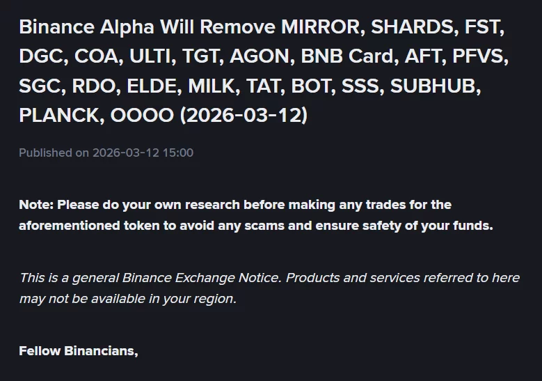 Binance Alpha MIRROR, SHARDS, FST, DGC, COA, ULTI, TGT, AGON, BNB Card, AFT, PFVS, SGC, RDO, ELDE, MILK, TAT, BOT, SSS, SUBHUB, PLANCK, OOOO’u kaldıracağını açıkladı. Son incelemeyle ilgili altcoinlerin Binance Alpha standartlarına uymadığı tespit edildiğinden paritelerin kaldırılmasına karar verildi. İlgili kripto paralar bugün itibariyle sadece satışa açık olacak.