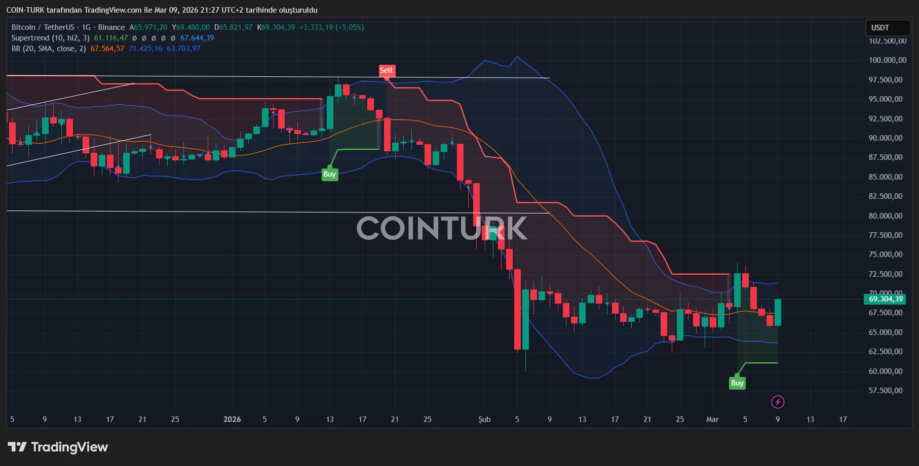 Trump’ın açıklamasının ardından petrol 90 dolara gerilerken SPX 6.770 seviyesine sıçradı ve DXY 98,8’e geriledi. Bitcoin 69.300 dolara dayandı.