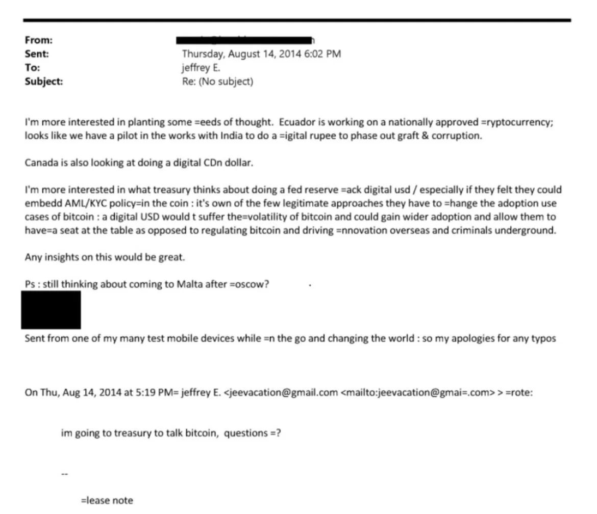 Mailin en altında, Epstein’ın bir önceki mesajı da görünüyor (Alıntılanmış metin). O kısımda Epstein şunu yazmış: “Bitcoin konuşmak için Hazine’ye gidiyorum, sorularınız?”