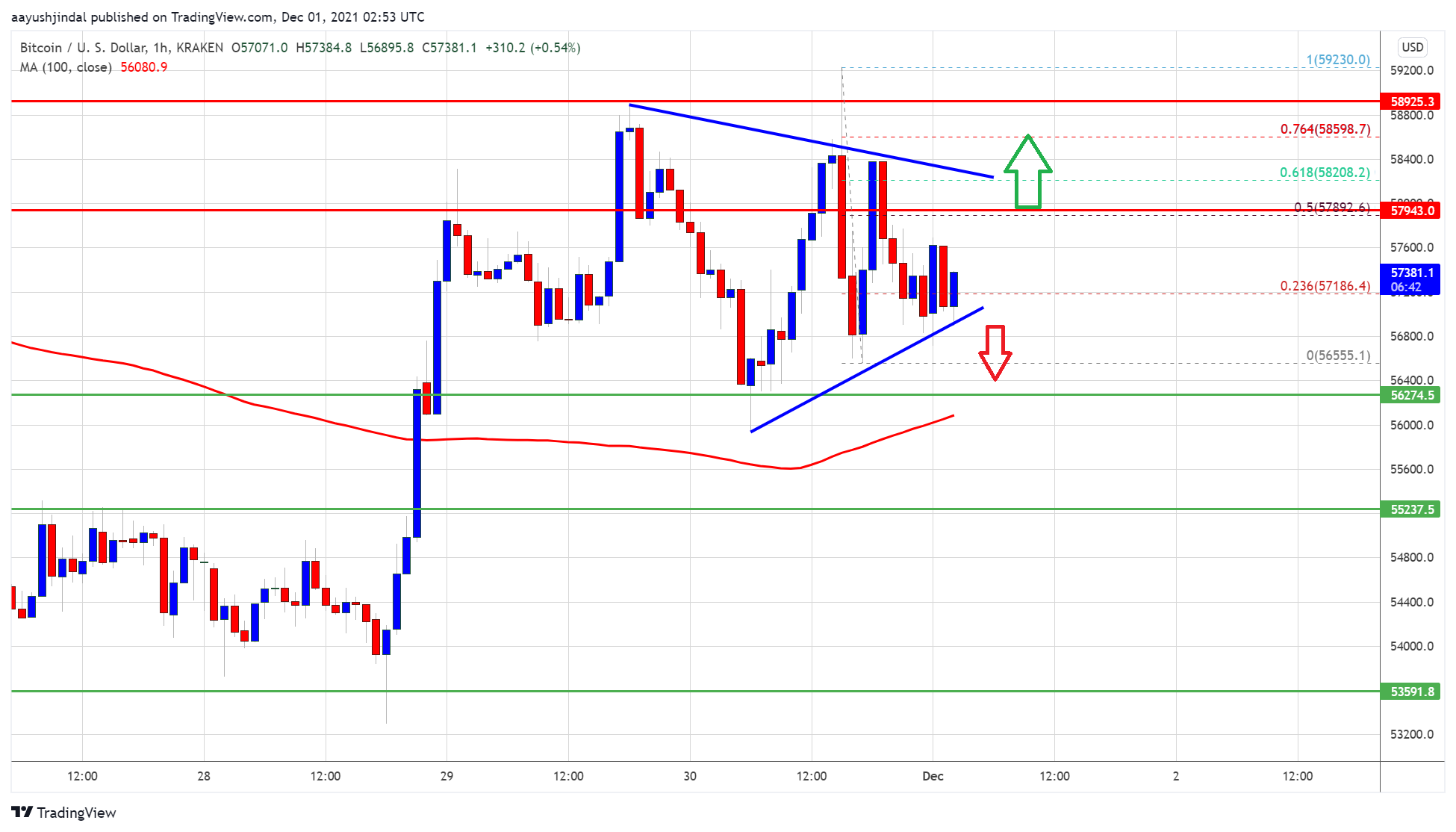 - Bitcoin fiyatı 57.000 dolar ve 100 saatlik basit hareketli ortalamanın üzerinde işlem görüyor.