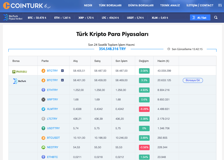 Sayfaya, CoinTürk en üst menüde yer alan “TÜRK BORSALARI” kısmından erişebilirsiniz. Sayfamızda borsaların BTC, TRY ve USD bazlı tüm çiftlerini bulacaksınız. Otomatik güncellenen veri sayfamız Türk kripto para piyasaları hakkında kripto para meraklılarına oldukça fazla fikir verecek. CoinTürk olarak Türkiye’de hizmet veren ve Türk Lirası ile işlem imkanı sunan borsaları yakından takip ediyor ve kullanıcılarımızın en detaylı veriye en kısa sürede ulaşmasını sağlayacak çözümler üretmeye çalışıyoruz. Hizmete yeni alınan “Türk Borsaları” sayfası sayesinde farklı borsaların anlık fiyat değişimlerini siteler arasında gezmek zorunda kalmadan takip edebileceksiniz. Bunun yanında kayda değer hacim üreten tüm işlem çiftlerini tek bir yerden takip edebileceksiniz.