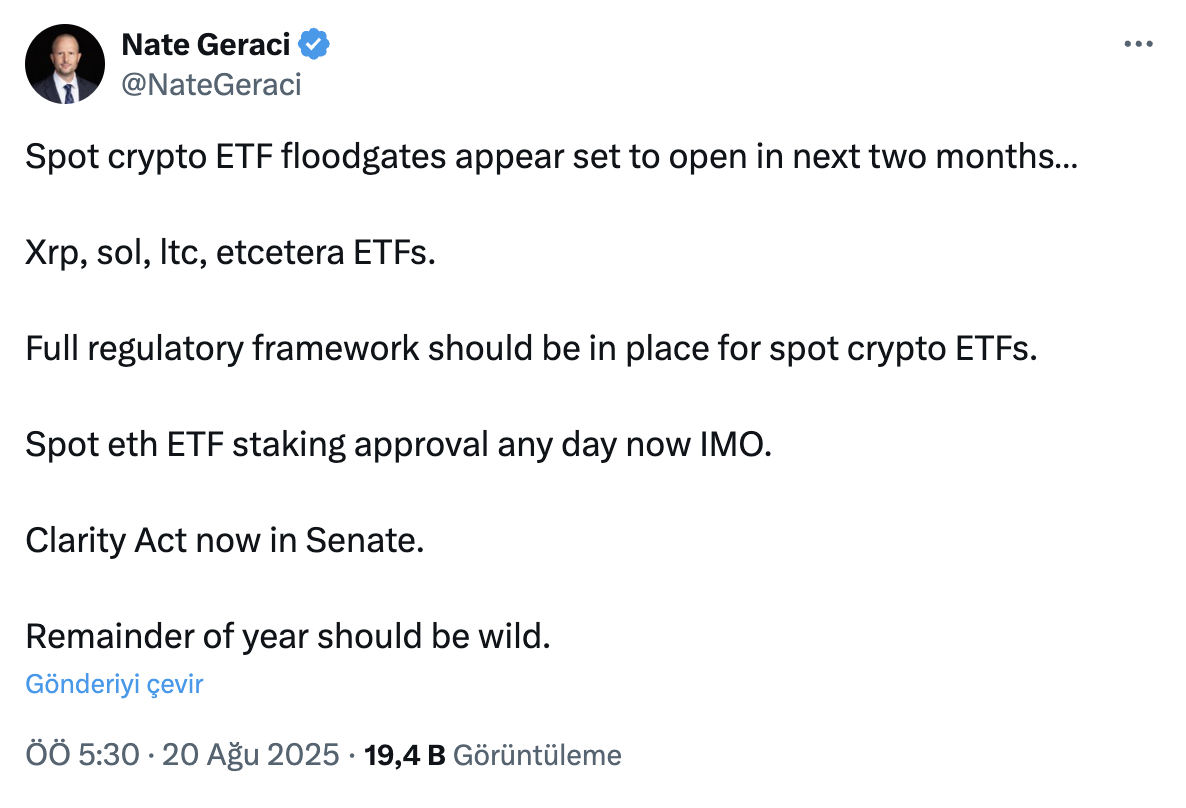 Geraci’ye göre takvim sıkışıyor ve Ekim, XRP’ye odaklı ETF‘ler için belirleyici ay konumunda. Onay gelmesi kurumsal yatırımcıların düzenlenmiş ürüne erişimini kolaylaştıracağı için XRP’ye potansiyel fon girişini destekleyebilir. Ayrıca analist mevcut spot Ethereum
